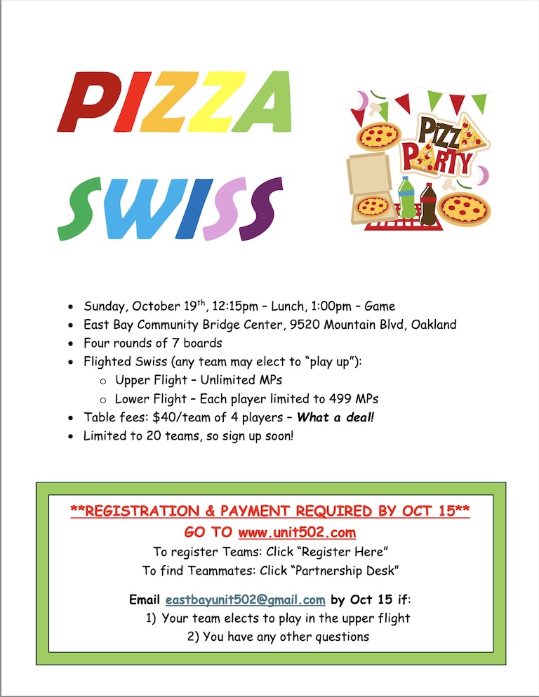 To find partners for the October 19th Pizza Swiss Teams click Partnership Desk