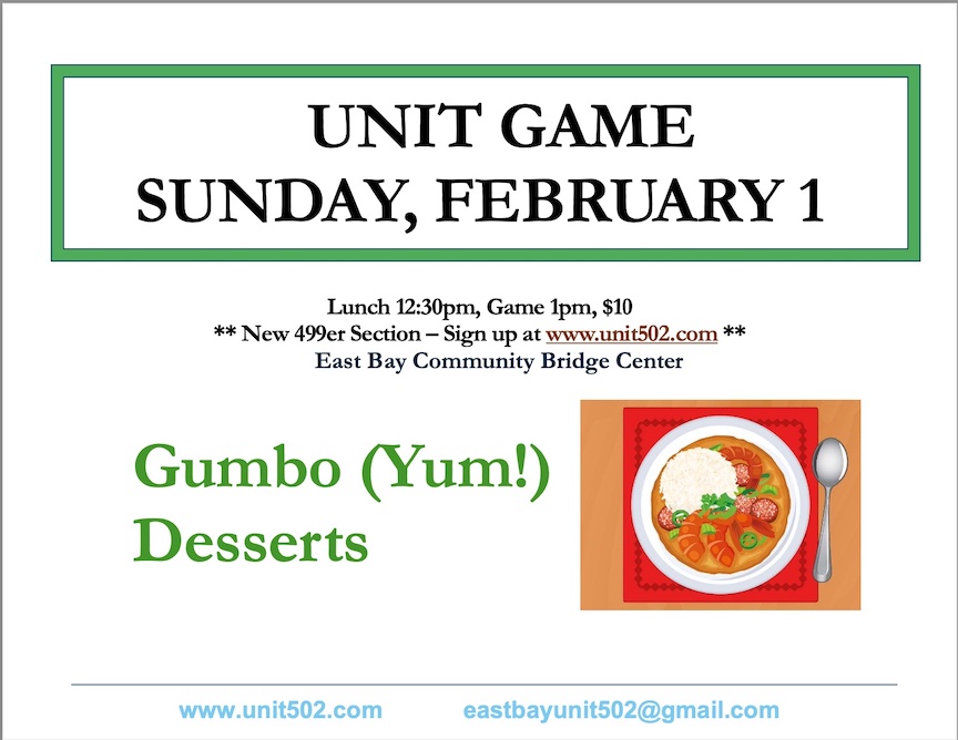 Next Unit Game Sunday February 1st. Lite Lunch at 12:30 PM
